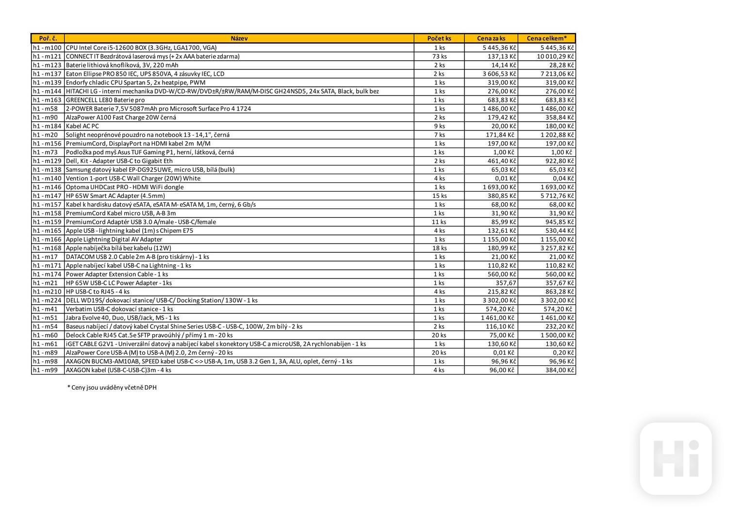 Celkem se prodává 227 položek – výpočetní technika a spotřební materiál (počítače, notebooky, monitory, tiskárny, datová média, síťové prvky, tonery, fotoaparáty aj.). Vše je rozděleno do sedmi souborů; tento inzerát se týká souboru č. 6 – komponenty a příslušenství. Seznam položek je uveden v příloze. Vyjma této hlavní nabídky je možné navrhnout vlastní kombinaci položek z různých souborů, pokud celková hodnota přesáhne 50 000 Kč včetně DPH – takový výběr musí být v nabídce přesně popsán.