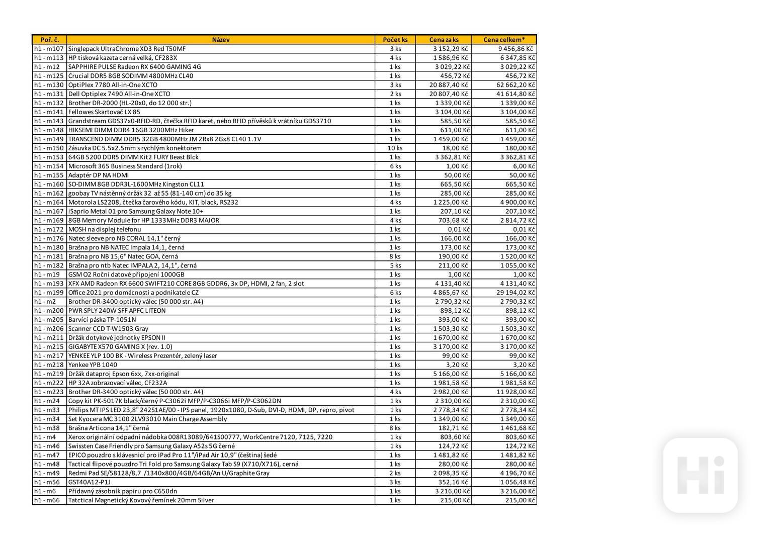 Celkem se prodává 227 položek – výpočetní technika a spotřební materiál (počítače, notebooky, monitory, tiskárny, datová média, síťové prvky, tonery, fotoaparáty aj.). Vše je rozděleno do sedmi souborů; tento inzerát se týká souboru č. 7 – ostatní drobný majetek. Seznam položek je uveden v příloze. Vyjma této hlavní nabídky je možné navrhnout vlastní kombinaci položek z různých souborů, pokud celková hodnota přesáhne 50 000 Kč včetně DPH – takový výběr musí být v nabídce přesně popsán.