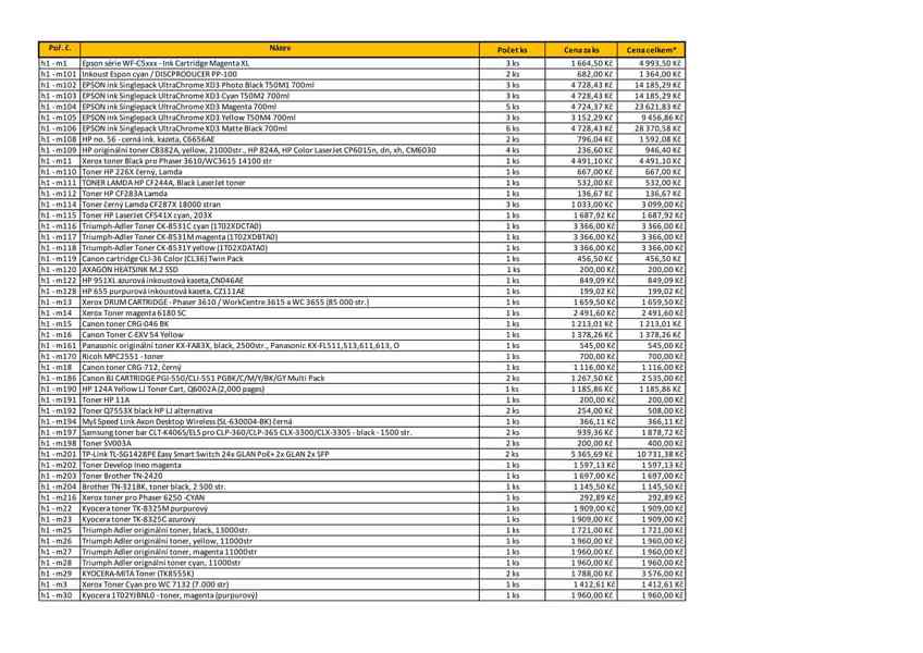 Celkem se prodává 227 položek – výpočetní technika a spotřební materiál (počítače, notebooky, monitory, tiskárny, datová média, síťové prvky, tonery, fotoaparáty aj.). Vše je rozděleno do sedmi souborů; tento inzerát se týká souboru č. 1 – spotřební materiál (tonery a cartridge). Seznam položek je uveden v příloze. Vyjma této hlavní nabídky je možné navrhnout vlastní kombinaci položek z různých souborů, pokud celková hodnota přesáhne 50 000 Kč včetně DPH – takový výběr musí být v nabídce přesně popsán.
